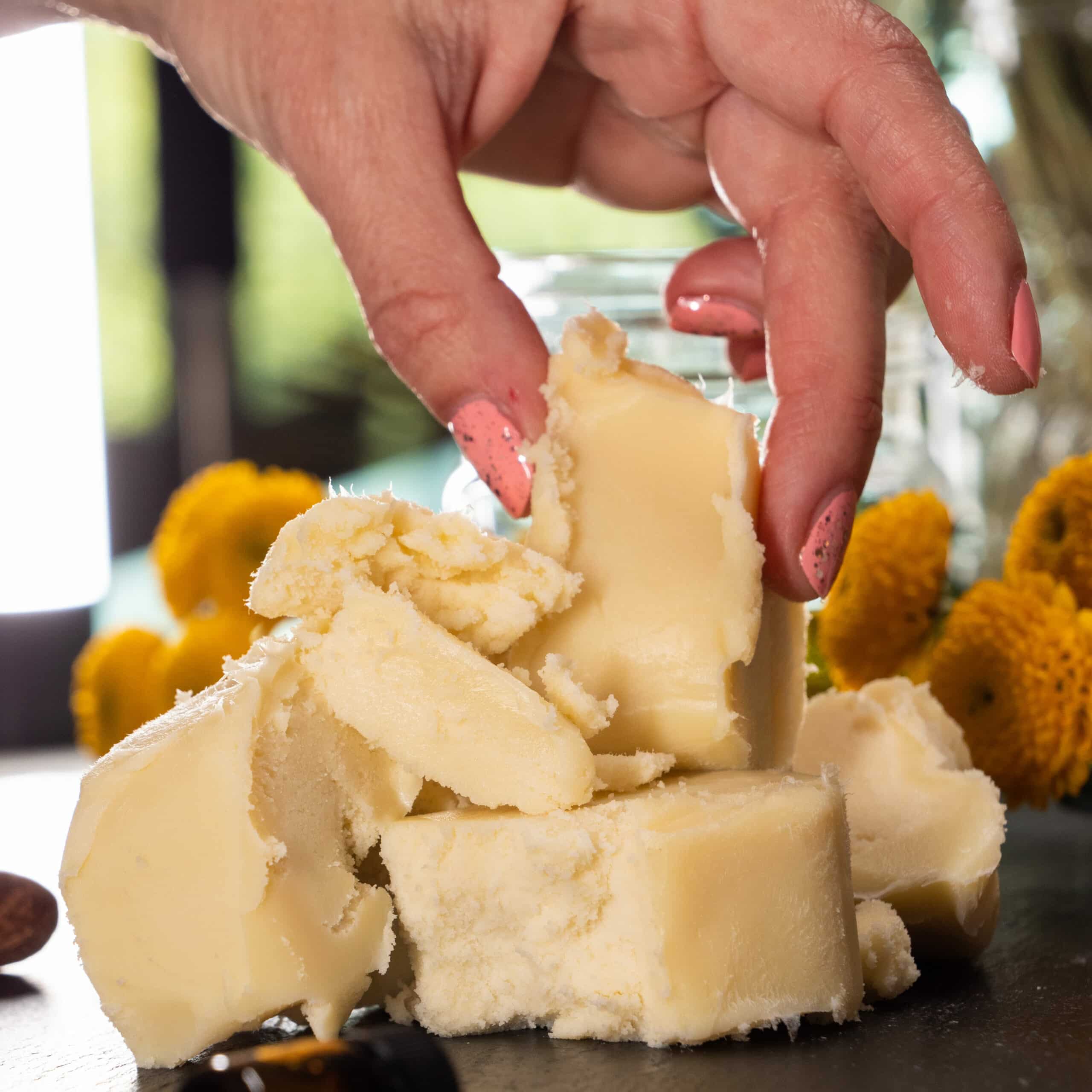 a) Raw African Shea Butter: Shea Butter is our top choice as a body butter base, for good reason! It suits every skin type and contains the healing factors that are known for soothing a multitude of skin issues including eczema, psoriasis, dermatitis and more.