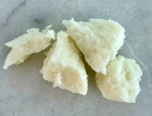 We have two choices of beeswax here at Better Shea Butter: our yellow pastilles, easy to measure and quick to melt, or our awesome Texas beeswax, which takes longer to melt because it comes in one hard block, but it smells like honey and it has a beautiful honey color. Guess which one we used for the salve! Yup, you got it, Texas Beeswax. But any beeswax will do the trick.