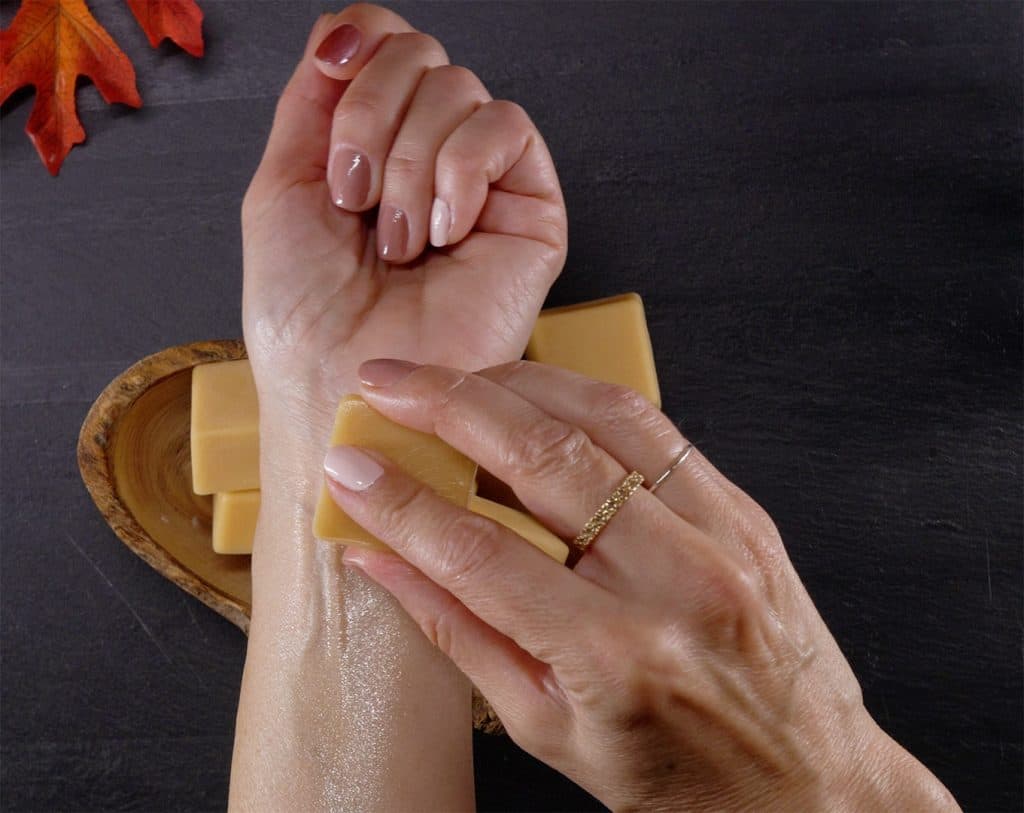 Lotion bars have the added benefit of creating less of an environmental footprint as they do not require a plastic bottle or other synthetic material to store and/or dispense them.